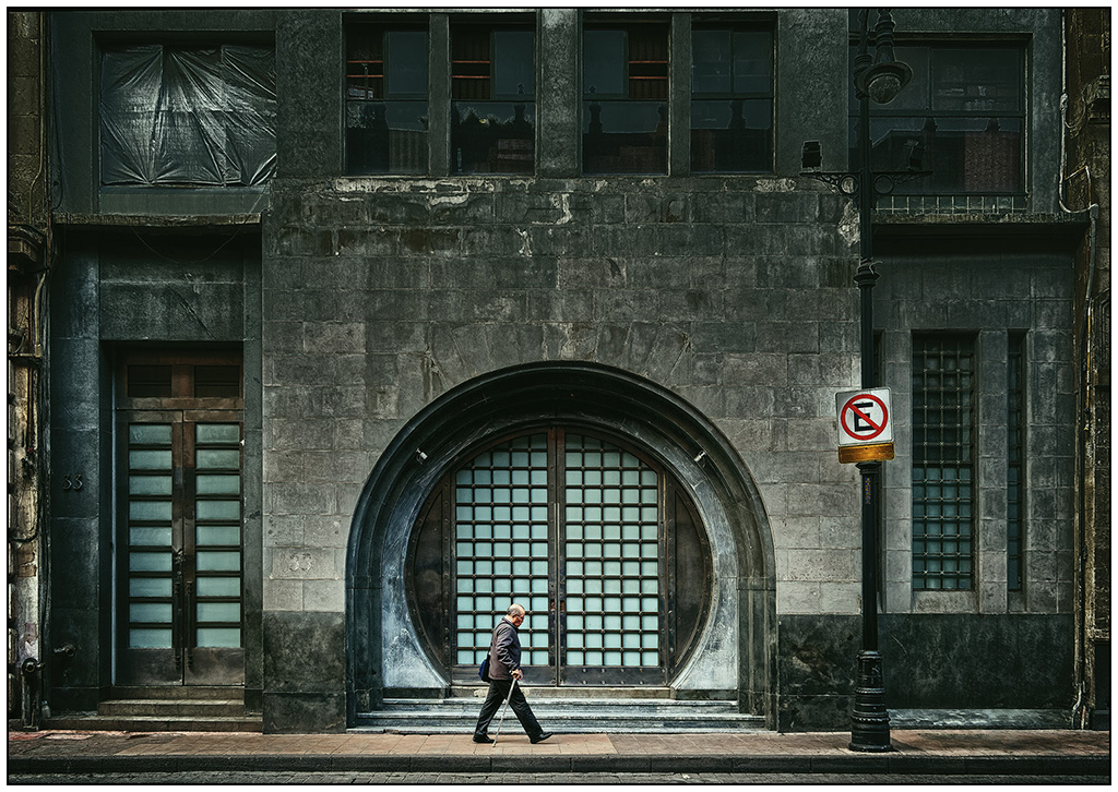 I took this image on a busy commercial street in the historic section of Mexico City. The round doorway in the abandoned building attracted me as a background so I posted myself across the street for ten minutes to take photos of people walking in front of the entrance. While it was difficult to find a time slot when no vehicles would come between my lens and my desired background, this one came through with a man taking a step just at the right moment. ~Rosemarie