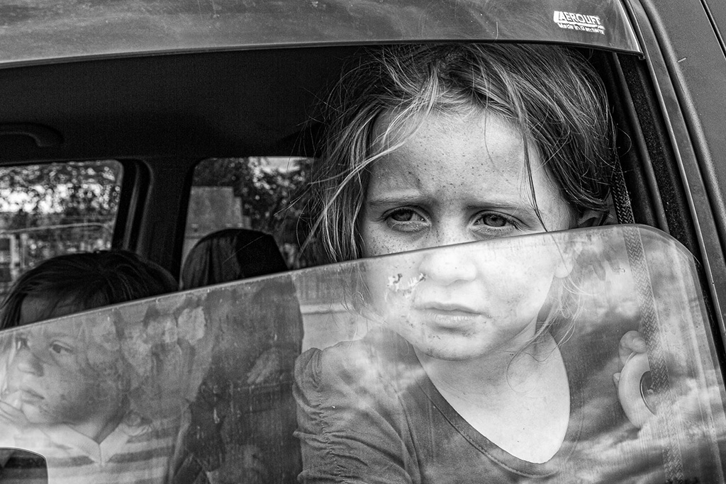 The Irish Travelers are an ethnic minority group named for their nomadic lifestyle. I had the opportunity to photograph several families in Ireland with a photographer Joseph-Philippe Bevillard who has been photographing Traveler families for the past 7 years and provided the incredible access into their lives. While many of my photographs of the Traveler children show them laughing and playing or posing, this image of Diane reveals a child in a solemn, pensive moment waiting in a car with her siblings which is more illustrative of their incredibly difficult lives. ~Sally