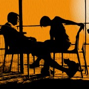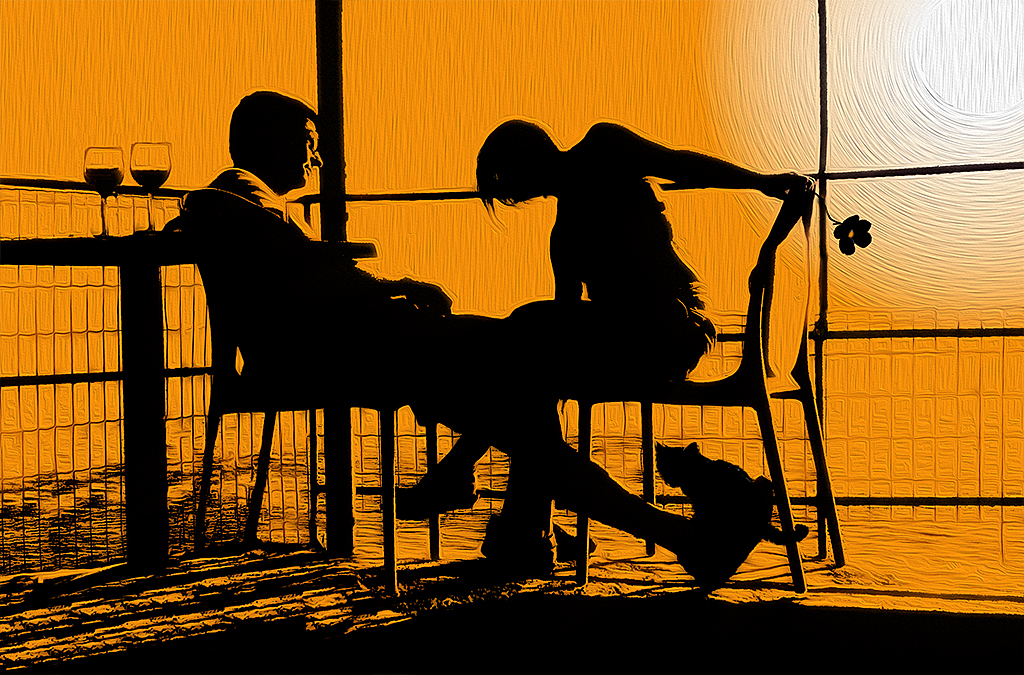 This pose, selected from few others, enticed me the most, because of the unusual dynamic asymmetry. I adjusted the contrast in Photoshop, but the picture still lacked something of that first impression. I used the “threshold” adjustment and, as an afterthought, added a yellow adjustment layer. It started to look promising…Then I made the sun more prominent and finally used the “Oil Paint” filter. It looked good but I did not have the emotional certainty I had there, that they were in love.
