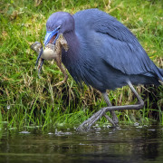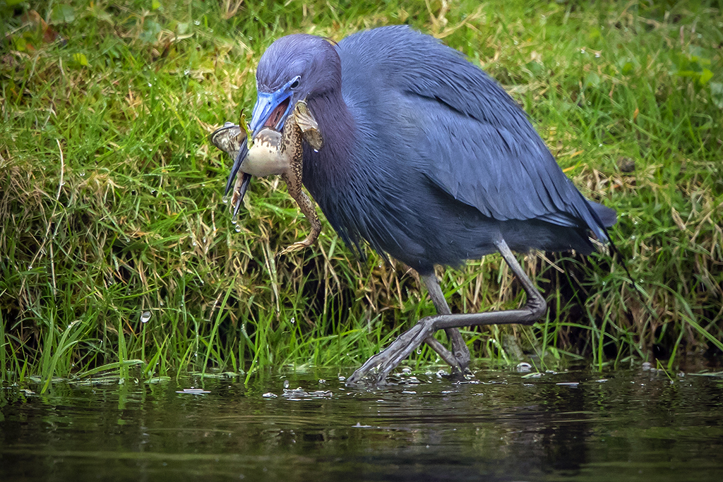“Captured in April 2018, it was a rainy day so I was looking for a location that I could photograph birds from my vehicle. I had read a report that a little blue heron was spotted at a local pond in Westport so decided to head over there to see what I could capture. There is a main pond on one side of the road and on the other side there’s a small pond at a private residence. This day the Heron was fishing the small pond. I sat and watched him capture several tadpoles as appetizers, and then it pulled this bullfrog out of the pond! The rainy cloudy day really brought out the blues in the heron and the greens in the grasses, and I was glad I caught a focused image of this successful hunt!”