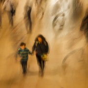 “I like to plan some extra time at Grand Central before my train home. The sun was shining through the west windows. I stood on the east landing looking back into the sun and tried panning passengers as they walked toward me. It took a while before this woman and child came into view. It was fortunate that there was separation between them and the others around them.”