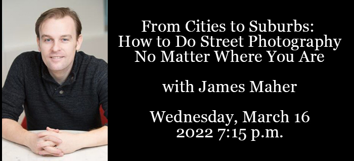 SPC Presents “From Cities to Suburbs: How to Do Street Photography No Matter Where You Are” by James Maher, Wednesday March 16, 7:15 p.m.