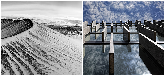 While walking through the new section of Warsaw, Poland, I noticed a modern building with a vertical slabs jutting from its structure. I was intrigued by its design so I got closer to inspect it. When I looked up, I saw clouds reflected in the glass. I then made a deliberate effort to align the protruding pieces when I composed the shot to achieve some symmetry. ~Rosemarie